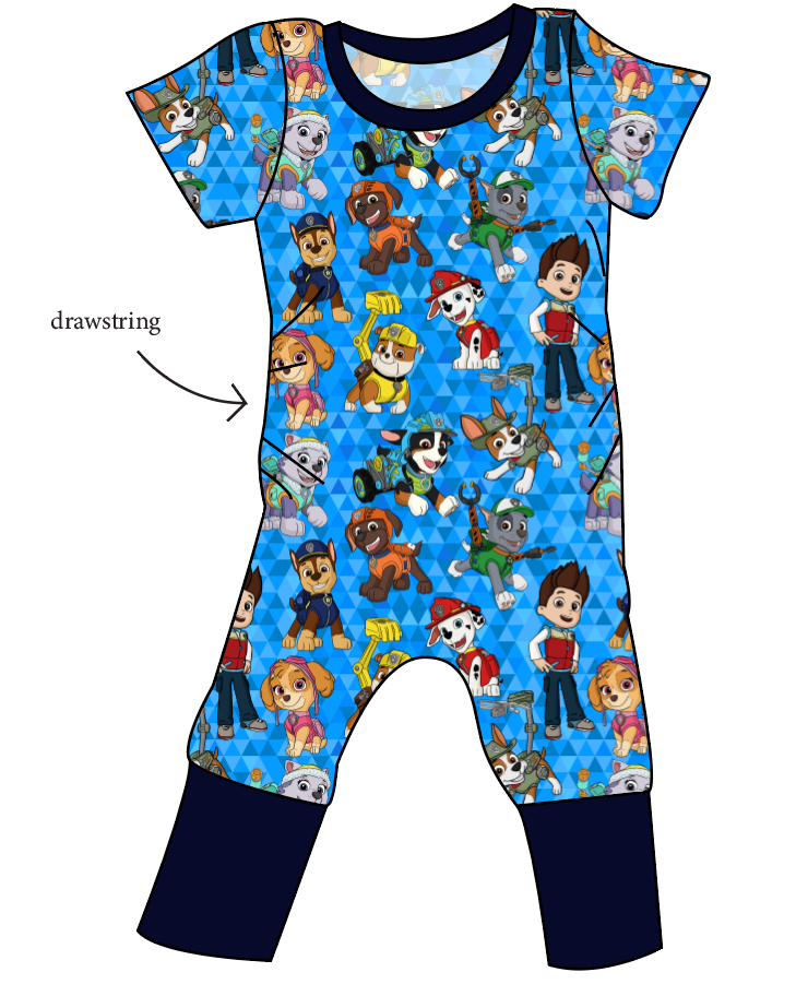 This romper is an awesome grow with me style: It features drawstrings in the sides to shorten the length, and when you pull them tight and cuff the ankles it will fit the smallest of the size range! Simply loosen the drawstring and un-roll the cuffs as they grow into it, making these awesome rompers last across 4 traditional sizes!