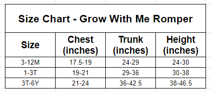 This romper is an awesome grow with me style: It features drawstrings in the sides to shorten the length, and when you pull them tight and cuff the ankles it will fit the smallest of the size range! Simply loosen the drawstring and un-roll the cuffs as they grow into it, making these awesome rompers last across 4 traditional sizes!